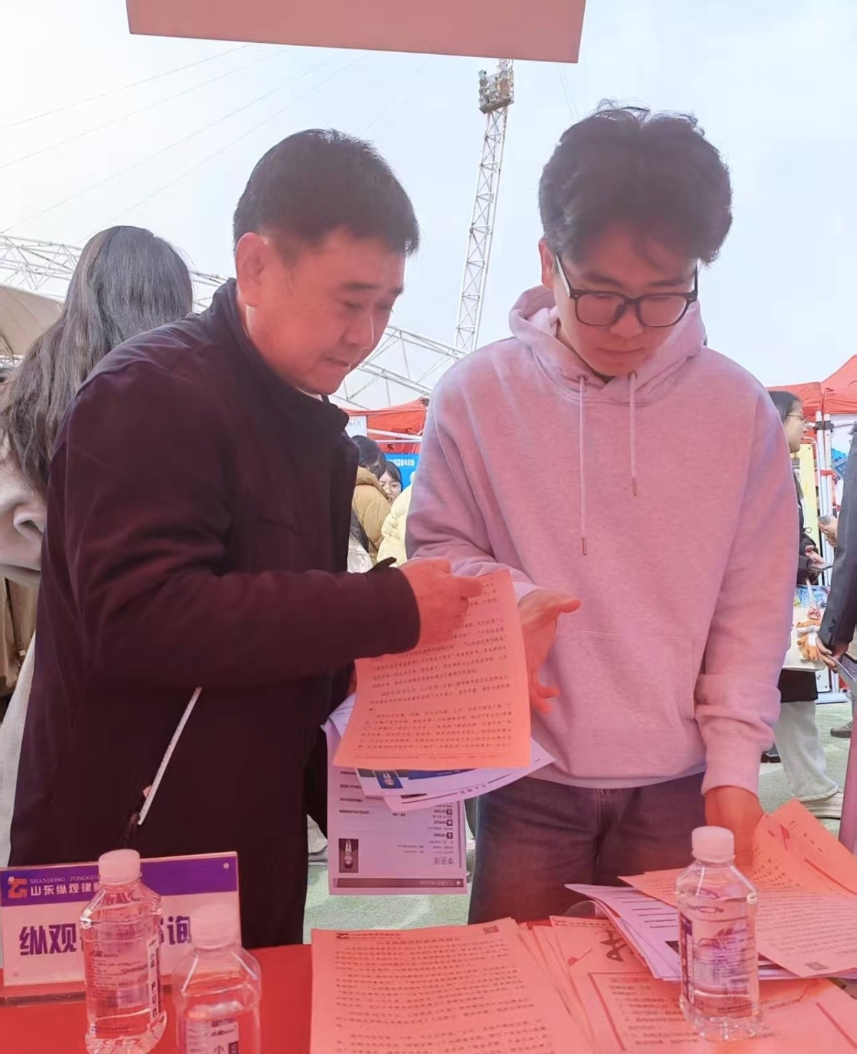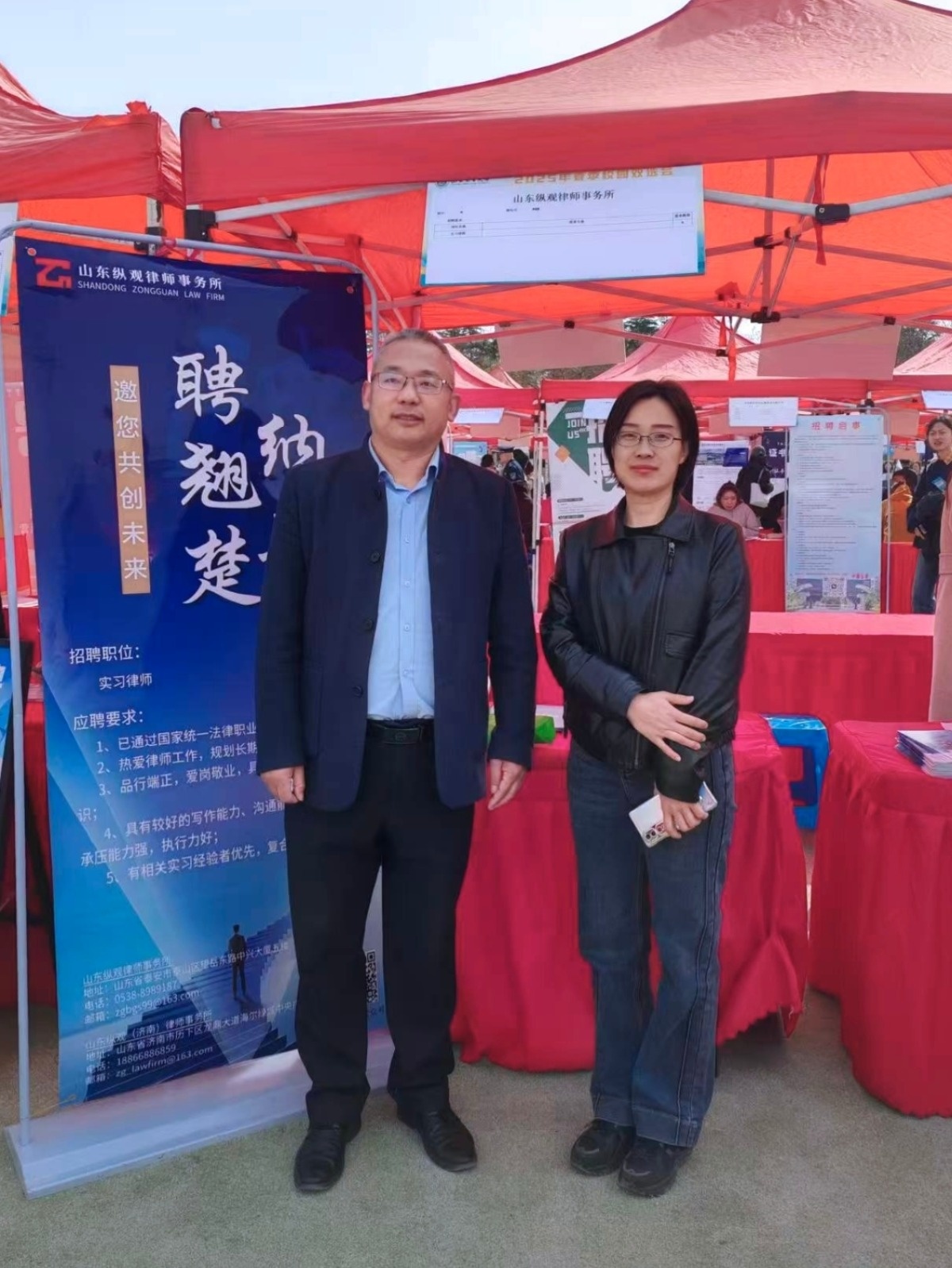 活动现场,山东纵观律师事务所的展位吸引了众多学生驻足。张生主任向同学们介绍了律所的发展历程、业务范围以及未来规划,着重强调了律所 “诚信、专业、担当” 的执业理念,展现了律所的良好形象与深厚底蕴。刑事业务部主任杨超律师围绕律所的特色业务进行了详细介绍,并对同学们在法律学习和职业规划方面的疑问进行了耐心解答,为同学们提供了宝贵的建议。