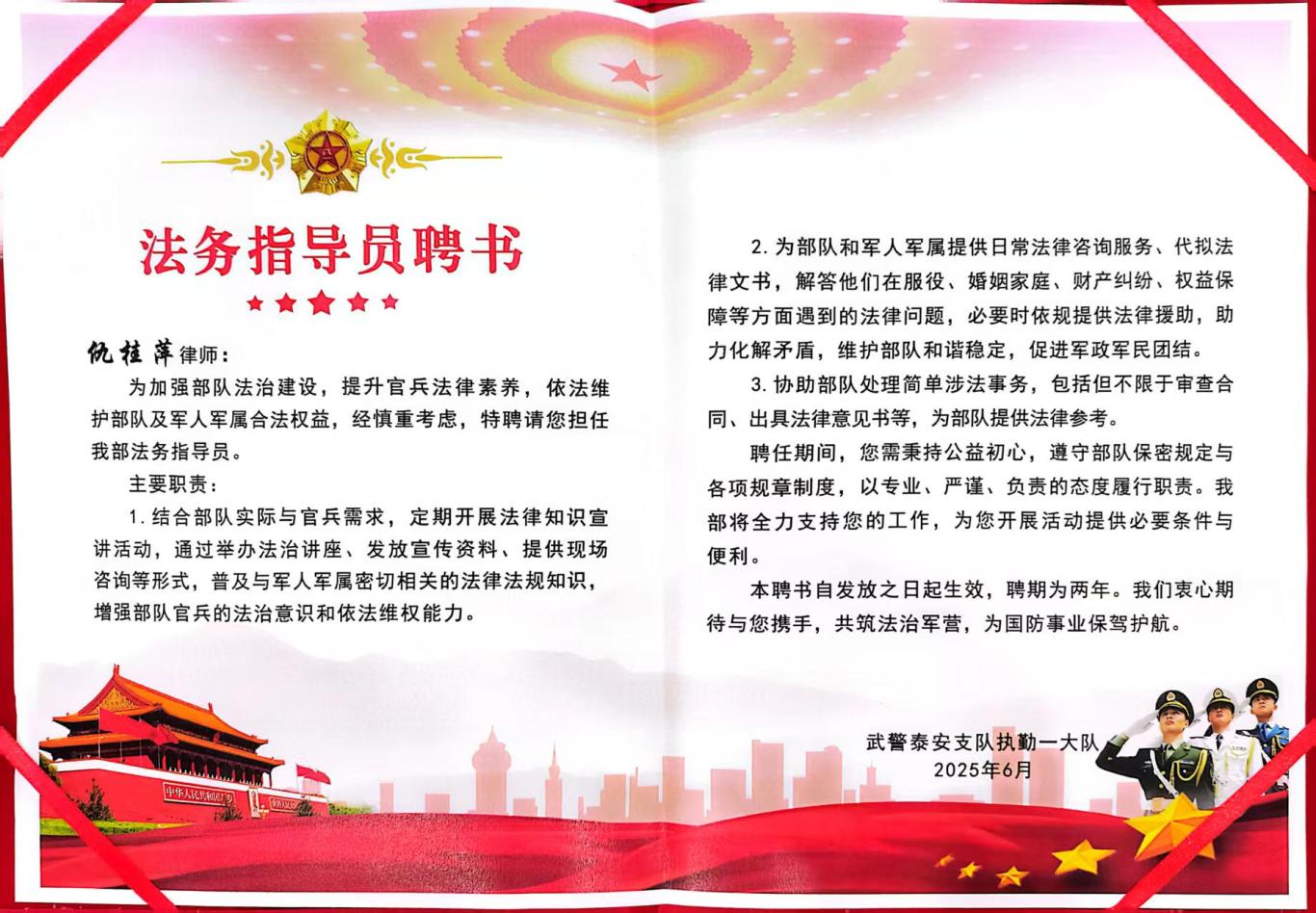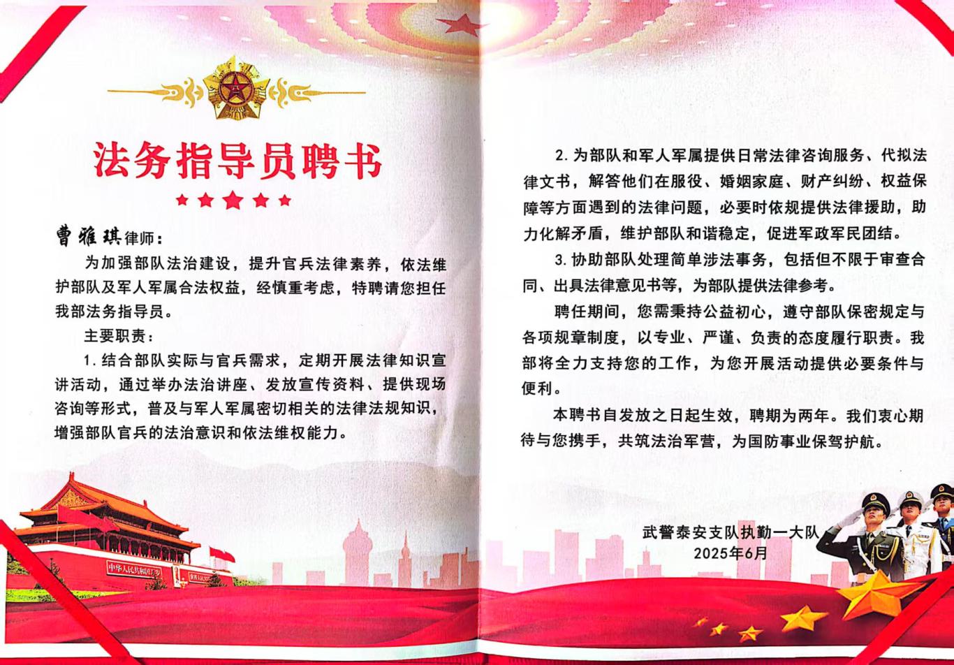 2025年6月27日,岱岳区“法律进军营”活动启动仪式上,山东纵观律师事务所曹雅琪、仇桂萍两位律师被聘为武警泰安支队“法务指导员”。